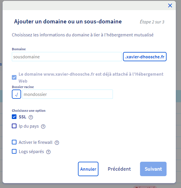 dans domaine rentrer le nom du sous domaine qui est le titre du site