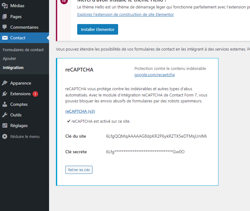 - sur le tableau de bord aller dans contact>intégration>recaptcha