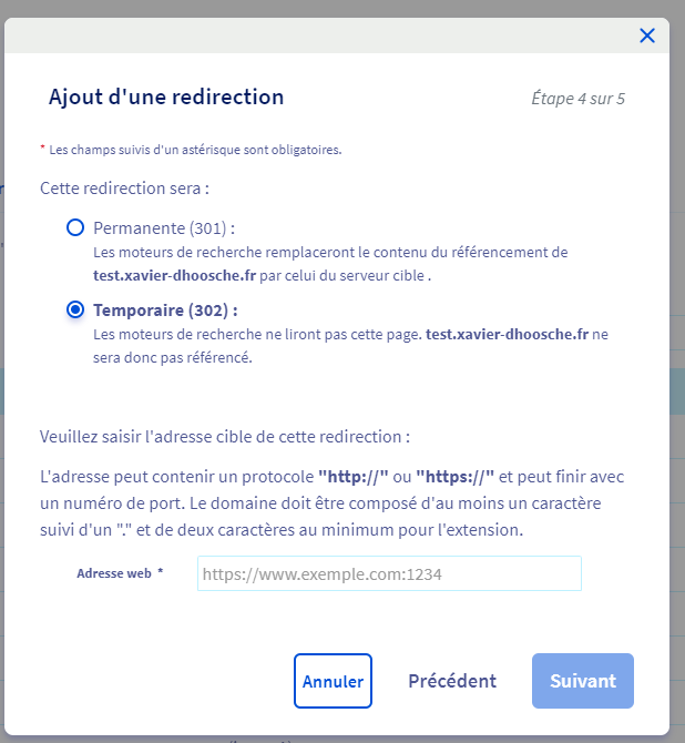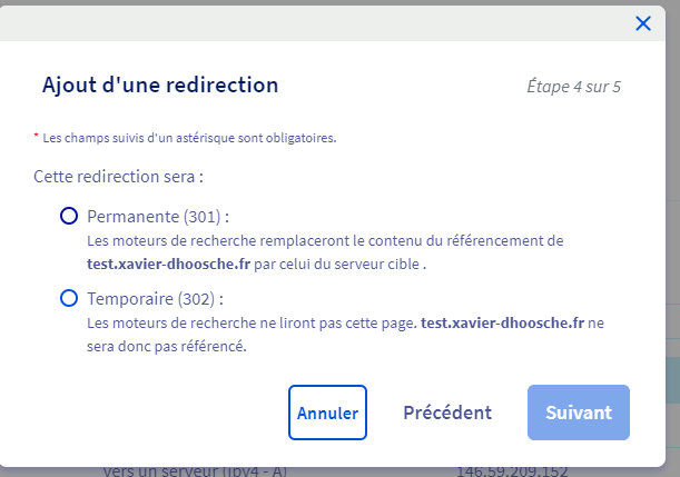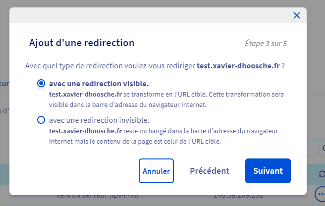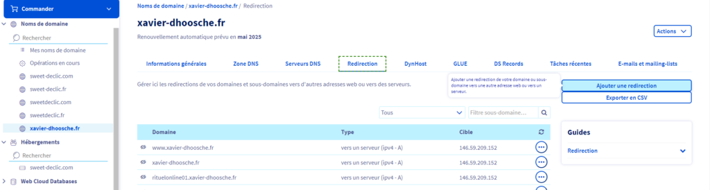 nom de domaine>choisir le nom de domaine>redirection>ajouter une redirection